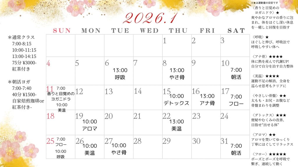 ※朝の短いクラス〈朝活ヨガ〉は約40分¥1500-となります。